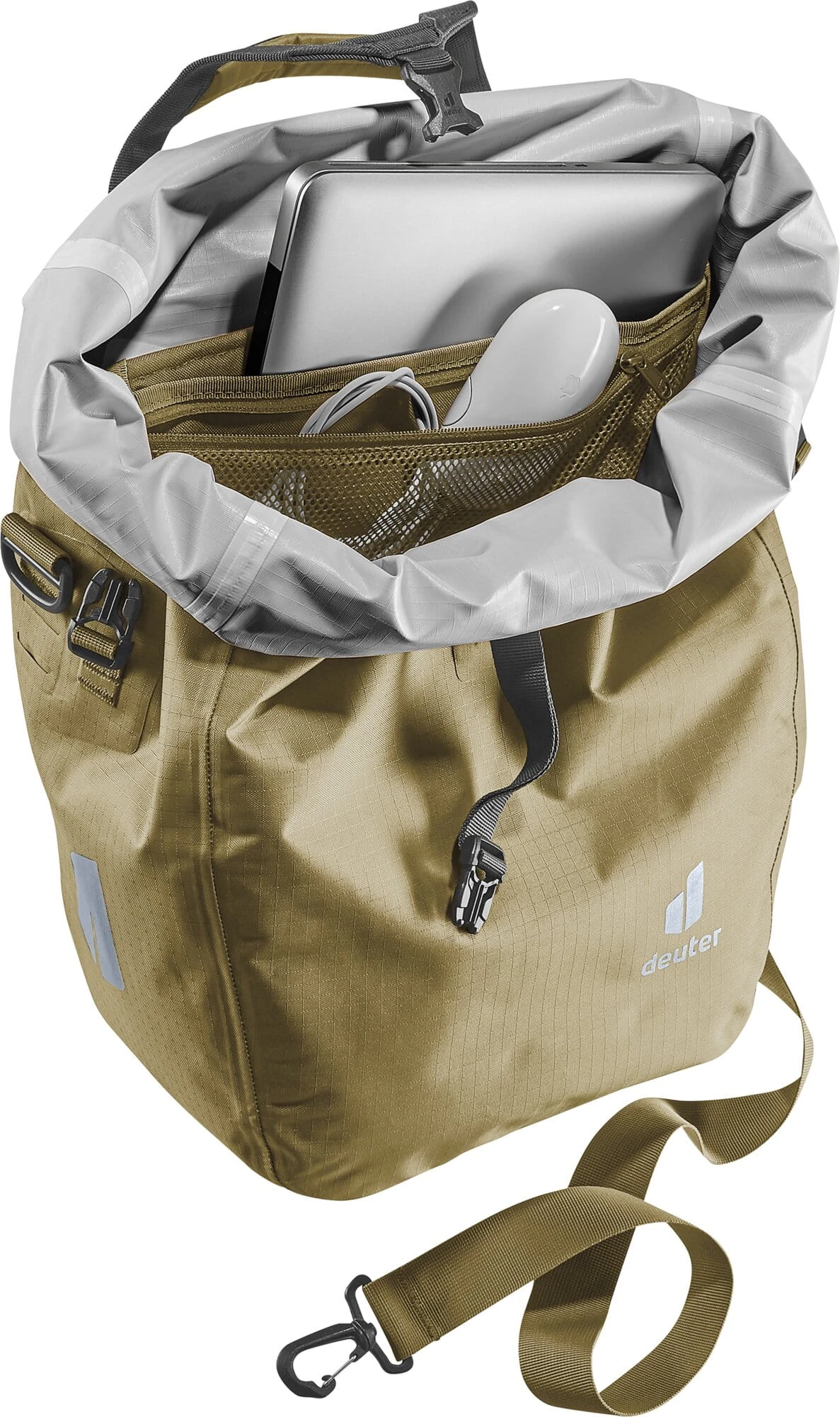 Of het nu gaat om een pure opbergtas met een organizereenheid op het achterwiel, een grotere schoudertas om om je nek te hangen of een praktische draagtas. Dankzij de afneembare schouderriem en verstelbare draaggreepsluiting met universele houder voor slaapmat of jas zijn er nauwelijks grenzen aan het gebruik van deze tas.