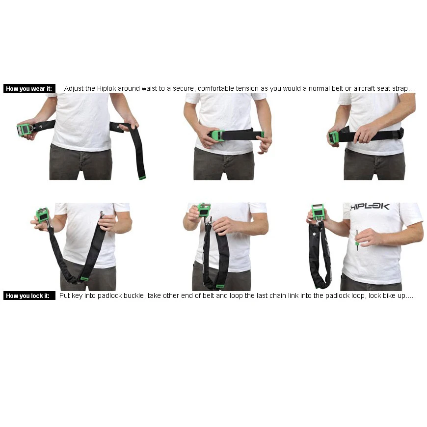 De Hiplok kettingsloten zijn gemaakt van gehard staal, een afneembare, waterafstotende nylon hoes en bieden talrijke vergrendelingsmogelijkheden. Alle draagbare Hiplok kettingsloten zijn voorzien van de gepatenteerde riemachtige sluiting, waardoor de sloten tijdens het rijden op de heup kunnen worden gedragen zonder dat ze op slot zitten. Hiplok biedt de kettingsloten aan in drie verschillende kettingdiktes, afhankelijk van het vereiste beveiligingsniveau – bekroond met goud, zilver of brons door Sold Secure.